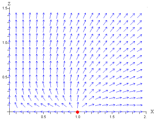 Las tablas de integrales elípticas (Good) nos da las siguientes equivalencias Las expresiones de las componentes del campo son, ahora, En la figura, se muestra la dirección del campo eléctrico mediante flechas, en el plano XZ, con x>0 y z>0. El módulo del campo no se puede mostrar ya que cambia significativamente de un punto cercano al anillo a otro algo más alejado. El radio del anillo es a=1.0 Caso particular Estudiamos el campo a lo largo del eje del anillo, x →0, Las integrales elípticas tienden ambas a K(0)=E(0)=π/2 Como podemos comprobar fácilmente Ex→0, fijarse que los dos últimos términos entre paréntesis se cancelan y Ex en el límite, resulta proporcional a x. En cuanto a la componente Z. Resultado que hemos obtenido previamente.