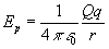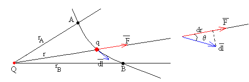 Energía potencialLa fuerza de atracción entre dos masas es conservativa, del mismo modo se puede demostrar que la fuerza de interacción entre cargas es conservativa. El trabajo de una fuerza conservativa, es igual a la diferencia entre el valor inicial y el valor final de una función que solamente depende de las coordenadas que denominamos energía potencial. El trabajo infinitesimal es el producto escalar del vector fuerza F por el vector desplazamiento dl, tangente a la trayectoria. dW=F·dl=F·dl·cosθ=F·dr. donde dr es el desplazamiento infinitesimal de la partícula cargada q en la dirección radial. Para calcular el trabajo total, integramos entre la posición inicial A, distante rA del centro de fuerzas y la posición final B, distante rB del centro fijo de fuerzas. El trabajo W no depende del camino seguido por la partícula para ir desde la posición A a la posición B. La fuerza de atracción F, que ejerce la carga fija Q sobre la carga q es conservativa. La fórmula de la energía potencial es El nivel cero de energía potencial se ha establecido en el infinito, para r=∞, Ep=0 El hecho de que la fuerza de atracción sea conservativa, implica que la energía total (cinética más potencial) de la partícula es constante, en cualquier punto de la trayectoria.