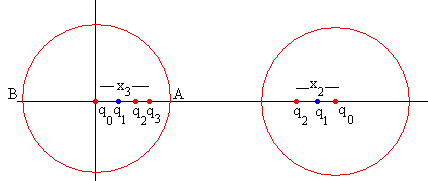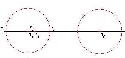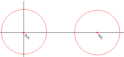Método de las imágenesEn páginas anteriores, hemos estudiado ejemplos de aplicación del método de las imágenes. En este página, aplicaremos dicho método a dos esferas del mismo radio R y de la misma carga Q, separadas entre sus centros una distancia d>2R. Situaremos el origen en el centro de la primera esfera. La simetría del problema nos permite reemplazar las esferas cargadas por dos sucesiones idénticas de cargas puntuales q0, q1…qn… situadas en la línea que une los centros en las posiciones x0, x1…xn … y d-x0, d-x1…d-xn …, respectivamente. Nos fijaremos exclusivamente en la primera esfera cuyo centro está en el origen. 1.-Colocamos una carga q0 en el centro de la primera esfera, en el origen x0=0. La superficie de la primera esfera de radio R es equipotencial. Colocamos una carga idéntica q0 en el centro de la segunda esfera. La superficie de la primera esfera deja de ser equipotencial.
