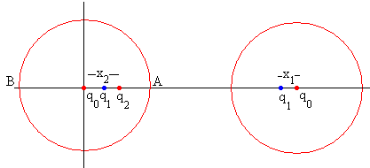 El potencial producido por la carga q0 situada en el centro de la segunda esfera y por la carga adicional q1 debe cancelarse en la superficie de la primera esfera, para que siga siendo equipotencial. El potencial en el punto A (R, 0) y B(-R, 0) producido por ambas cargas debe ser cero