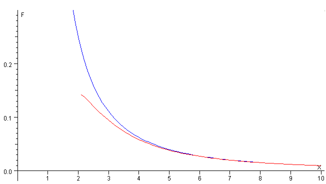 que es la fuerza de repulsión entre dos cargas puntuales Q situadas a una distancia d. En la figura, se compara la fuerza de repulsión ente dos cargas puntuales Fc (en azul), y el desarrollo en serie de la fuerza F entre dos esferas conductoras iguales en términos del parámetro β=R/d hasta el término 18, en rojo, para d>2.1R