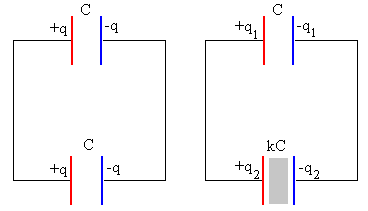 Condensadores en paraleloSupongamos que tenemos dos condensadores iguales cargados con la misma carga q, en paralelo. Si introducimos un dieléctrico de constante dieléctrica k en uno de los condensadores. La capacidad del condensador con dieléctrico aumenta, la diferencia de potencial entre sus placas disminuye. Al unir las placas del mismo signo de los dos condensadores, la carga se repartirá hasta que se igualen de nuevo sus potenciales La analogía hidráulica se muestra en la figura inferior 2q=q1+q2