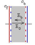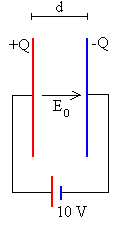 Sean polares o no polares las moléculas de un dieléctrico, el efecto neto de un campo exterior se encuentra representado en la figura inferior. Al lado de la placa positiva del condensador, tenemos carga inducida negativa y al lado de la placa negativa del condensador, tenemos carga inducida positiva. Como vemos en la parte derecha de la figura, debido a la presencia de las cargas inducidas el campo eléctrico entre las placas de un condensador con dieléctrico E es menor que si estuviese vacío E0. Algunas de las líneas de campo que abandonan la placa positiva penetran en el dieléctrico y llegan a la placa negativa, otras terminan en las cargas inducidas. El campo y la diferencia de potencial disminuyen en proporción inversa a su constante dieléctrica k.=є/є0 E=E0/k Ejemplo: Se conecta un condensador plano-paralelo a una batería de 10 V. Los datos del condensador son: