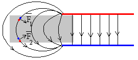La fuerza sobre el dieléctrico es debida al campo existente fuera del dieléctrico Así, consideremos dos moléculas del dieléctrico, polarizadas por el campo existente fuera del condensador y dispuestas simétricamente, como se muestra en la figura de la derecha. Las fuerzas sobre cada una de las dos cargas de una molécula son tangentes a la línea de fuerza en el punto en la que está situadas las cargas y son opuestas pero no son completamente colineales y por tanto, existe una fuerza resultante sobre cada molécula que representamos por F1 y F2. La fuerza neta sobre el par de moléculas F1+F2 está dirigida hacia la derecha. La fuerza sobre el dieléctrico es la suma de las fuerzas que ejerce el campo eléctrico sobre todos los pares de moléculas.