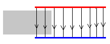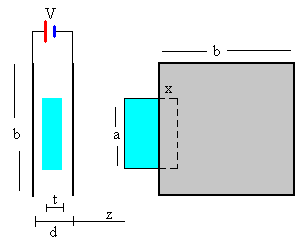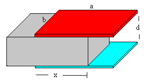 Supongamos que el dieléctrico ha penetrado una longitud x<a en el condensador inicialmente vacío. Para hallar la capacidad del condensador con dieléctrico podemos considerar el condensador como la agrupación de dos condensadores en paralelo, uno con dieléctrico de longitud x, y otro en el vacío de longitud a-x. Tenemos que la capacidad total de la agrupación es la suma de las capacidades de cada uno de los condensadores planos-paralelos.