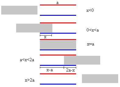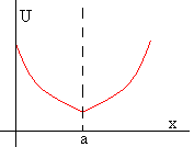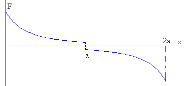 Como podemos apreciar la capacidad C es simétrica respecto de x=a. El valor de la capacidad C, de la energía electrostática U y el módulo de la fuerza F es el mismo para x=a-δ, y para x=a+δ. Como podemos ver en las gráficas arriba de la capacidad y más abajo de la energía U y de la fuerza F.