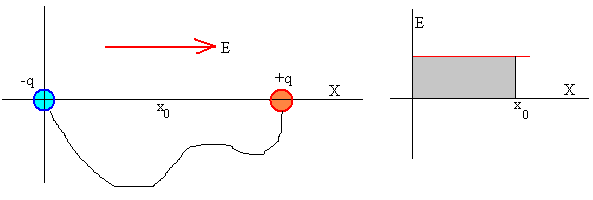 Dos esferas conductoras en un campo eléctrico uniformeExaminamos ahora, el siguiente problema. Dos esferas conductoras del mismo radio R, inicialmente descargadas están unidas mediante un hilo conductor. Se colocan en una región en la que existe un campo eléctrico uniforme E, paralelo al eje X, tal como se muestra en la figura. El centro de la primera esfera está fijada en el origen y el centro de la segunda se desplaza a una distancia x0. El radio de las esferas es pequeño para que el efecto de las cargas inducidas en sus superficies sea despreciable.