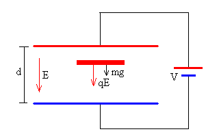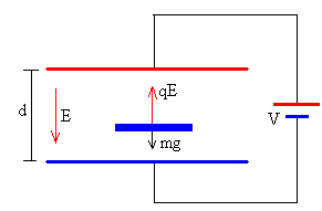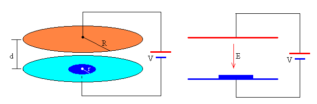 Consideremos un condensador consistente en dos placas circulares de radio R separadas una distancia d, donde d<<R. Podemos considerar, entonces, que el campo en el interior del condensador es aproximadamente constante. Las placas del condensador se conectan a una batería cuya diferencia de potencial constante es V. Un pequeño disco de masa m, de radio r<<R y de espesor w<<r se coloca en el centro de la placa inferior, tal como se muestra en la figura. Se supondrá que las placas y el disco son conductores perfectos y se despreciarán los efectos de los bordes.