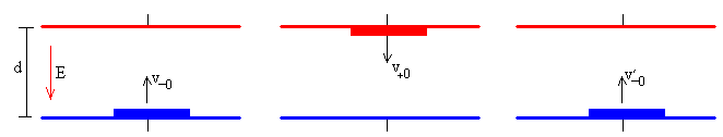 En la posición inicial de partida, la energía del disco es cinética y potencial eléctrica En la posición final, cuando llega a la placa positiva, su energía es potencial gravitatoria y cinética. Aplicamos el principio de conservación de la energía y obtenemos el mismo resultado que aplicando las ecuaciones de la dinámica. Choque del disco con la placa superior positivaEl disco con velocidad v- choca con la placa, la velocidad del disco después del choque es v+0=ev- siendo e≤1 el coeficiente de restitución. El valor e=1 corresponde al choque elástico En el momento del choque, el disco pierde su carga q negativa y adquiere una carga igual y de sentido contrario, q positiva. La batería suministra carga a las placas a fin de mantener constante la carga Q de las mismas. Movimiento hacia abajoExaminamos el movimiento del disco hacia abajo, de la placa positiva a la negativa. Cambiamos el origen y el sentido del eje vertical. Situamos el origen en la placa superior y el eje Y apunta ahora, hacia abajo, de modo que la velocidad inicial y la aceleración son positivas. Ponemos el contador de tiempo t a cero.