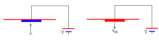 Se pulsa el botón titulado Empieza Se observa, ascender el disco, si la diferencia de potencial entre las placas es superior al valor crítico, es decir, si la aceleración a->0. Después de varias oscilaciones, se alcanza el estado estacionario. En la parte derecha del applet, se representa la velocidad v-0 con que inicia el disco su movimiento ascendente desde la placa inferior, en función del tiempo t. Dicha velocidad tiende hacia el valor constante