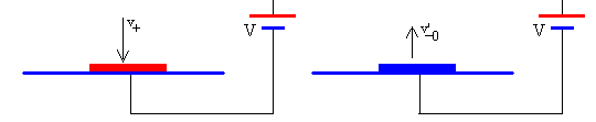 El disco con velocidad v+ choca con la placa. La velocidad del disco después del choque es v’-0=ev+ En el momento del choque el disco pierde su carga q positiva y adquiere una carga igual y de sentido contrario, q negativa. La batería suministrar carga a las placas a fin de mantener constante la carga Q de las mismas. De este modo, hemos completado un ciclo, partiendo el disco de la placa inferior con una velocidad v’-0 Oscilación completaResumimos las ecuaciones deducidas en el apartado anterior El disco parte de la placa inferior con velocidad v-0 y llega a la placa superior con velocidad