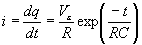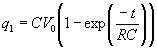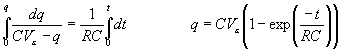 La ecuación del circuito es iR+q/C-Ve =0 Teniendo en cuenta que la intensidad se define como la carga que atraviesa la sección del circuito en la unidad de tiempo, i=dq/dt, tendremos la siguiente ecuación para integrar Derivando con respecto al tiempo, obtenemos la intensidad en función del tiempo La carga tiende hacia un valor máximo C·Ve al cabo de un cierto tiempo, teóricamente infinito. La intensidad disminuye exponencialmente con el tiempo, hasta que se hace cero cuando el condensador adquiere la carga máxima. La cantidad RC que aparece en el denominador de t se denomina constante de tiempo del circuito. Este representa el tiempo que tomará a la corriente para decrecer hasta 1/e de su valor inicial. Un tubo-capilar alimentado por un flujo constante producido por un frasco de Mariotte es la analogía hidráulica de la carga de un condensador. Balance energético