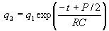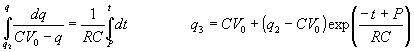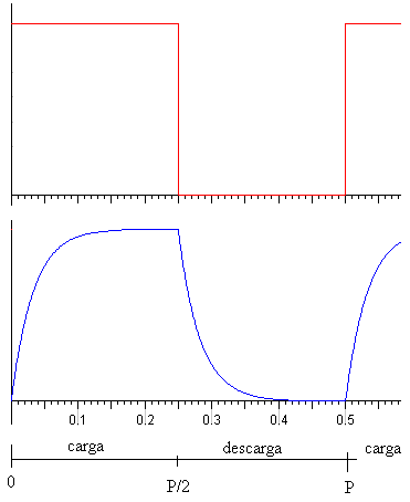 Como se ve en la figura, durante el primer semiperiodo de la señal la fem tiene un valor constante e igual a V0. El condensador se carga durante un tiempo P/2. La carga q1 final del condensador en el instante t=P/2 se calcula a partir de la fórmula En el instante t=P/2 la fem se hace cero, el condensador se descarga. La carga del condensador q2 en el instante t=P se calcula a partir de la fórmula, En el siguiente proceso de carga, la integración no es entre los límites 0 y q, sino entre la carga remanente q2 y q. Calculamos la carga final q3 en el instante t=P+P/2. Y así, sucesivamente.