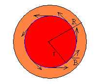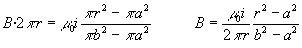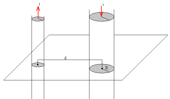 Fuerza entre corrientes de sección no nulaHemos estudiado la fuerza entre dos corrientes rectilíneas indefinidas, paralelas separadas una distancia d. Cuando las corrientes circulan en el mismo sentido, la fuerza es atractiva y cuando las corrientes circulan en sentido contrario la fuerza es repulsiva. Hemos supuesto que el radio de la sección de las corrientes es muy pequeña comparada con la distancia d de separación entre las mismas. En este apartado, vamos a considerar dos casos:
