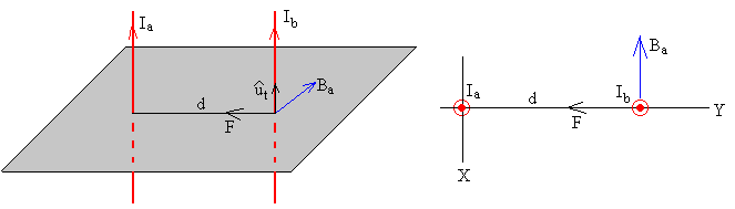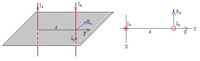 Fuerza entre dos corrientes rectilíneasSean dos corrientes rectilíneas indefinidas de intensidades Ia e Ib paralelas y distantes d. El campo magnético producido por la primera corriente rectilínea en la posición de la otra corriente es De acuerdo con la regla de la mano derecha tiene el sentido indicado en la figura, en forma vectorial Ba=-Bai La fuerza sobre una porción L, de la segunda corriente rectilínea por la que circula una corriente Ib en el mismo sentido es Como podemos comprobar, la fuerza que ejerce el campo magnético producido por la corriente de intensidad Ib sobre la una porción de longitud L de corriente rectilínea de intensidad Ia, es igual pero de sentido contrario. La fuerza por unidad de longitud ente dos corrientes rectilíneas indefinidas y paralelas, distantes d es La unidad de medida de la intensidad de la corriente eléctrica, el ampere, se fundamenta en esta expresión: El ampere (A) es la intensidad de una corriente constante que manteniéndose en dos conductores paralelos, rectilíneos, de longitud infinita, de sección circular despreciable y situados a una distancia de un metro uno de otro en el vacío, produciría una fuerza igual a 2·10-7 newton por metro de longitud. Si las corrientes tienen sentido opuesto, la fuerza tiene el mismo módulo pero de sentido contrario, las corrientes se atraen, tal como se aprecia en la figura Dos corrientes rectilíneas indefinidas, paralelas, separadas una distancia d