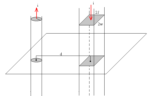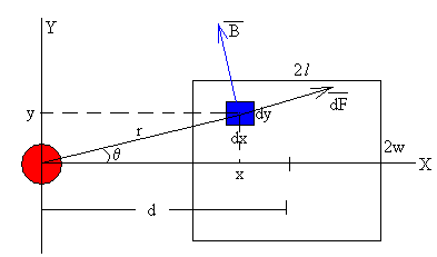 y que las dimensiones de la sección son comparables con la separación d entre las mismas. Este aparatado, es de interés para los lectores que disfruten con el cálculo integral. Corriente de sección rectangularEl campo producido por una corriente rectilínea indefinida i, para distancias mayores que el radio de la sección circular, es. Vamos a calcular la fuerza que ejerce dicho campo sobre una corriente rectilínea indefinida de sección rectangular de dimensiones 2l (largo)y 2w (ancho), distante d. Primero calculamos la fuerza que dicho campo ejerce sobre un elemento de corriente de dimensiones dx y dy. Suponiendo que la intensidad i está uniformemente distribuida en toda la sección rectangular, la corriente que circula por dicha sección infinitesimal (en color azul) es La fuerza sobre una porción de corriente rectilínea indefinida de longitud L
