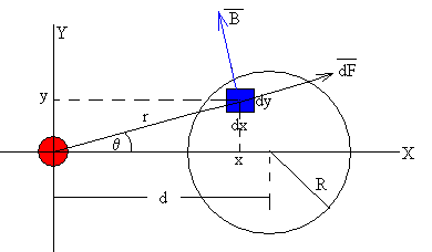 Las componentes de dicha fuerza son: dFx=dFcosθ Por simetría, las componentes dFy se anulan de dos en dos, la fuerza resultante tiene la dirección del eje X El término ente paréntesis corresponde a la fuerza entre dos corrientes rectilíneas indefinidas paralelas que distan d. Para calcular la fuerza resultante Fx tendremos que calcular una integral doble La integral con respecto a x es inmediata Ahora, tenemos que resolver la integral Integramos por partes Descomponemos la integral racional en la suma de dos integrales, del siguiente modo Resolvemos el sistema de cuatro ecuaciones con cuatro incógnitas A=0, C=0, B=-2a2, D=2b2 Una vez que tenemos la función integrando calculamos el valor de la integral definida. La fuerza resultante es La fuerza de atracción entre dos corrientes rectilíneas indefinidas, se ve afectada por un factor multiplicativo f que depende de las dimensiones (w, l) de sección rectangular de la corriente y de su separación d de la corriente rectilínea que produce el campo magnético. Corriente de sección circularCalculamos ahora, la fuerza sobre una corriente indefinida de sección circular de radio R, que dista d de la corriente rectilínea indefinida que produce el campo magnético, ambas conducen la misma intensidad i pero en sentidos contrarios. El campo producido por una corriente rectilínea indefinida i, es. Vamos a calcular la fuerza que ejerce dicho campo sobre la corriente de sección circular de radio R, que dista d de la corriente rectilínea. Primero calculamos la fuerza que dicho campo ejerce sobre un elemento de corriente de dimensiones dx y dy. Suponiendo que la intensidad i está uniformemente distribuida en toda la sección circular, la corriente que circula por dicha sección infinitesimal es La fuerza sobre una porción de corriente rectilínea indefinida de longitud L