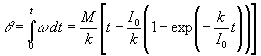 Integrando de nuevo obtenemos el ángulo girado q por la rueda en función del tiempo t. Cuando se alcanza el estado estacionario (el valor de la exponencial tiende a cero), la velocidad angular de rotación tiende hacia un valor constante y el ángulo girado por la rueda es proporcional al tiempo. Una situación análoga a la de una esfera que cae en el seno de un fluido viscoso. Las medidas experimentales reales indican que el estado estacionario se alcanza inmediatamente, de modo que se observa una relación lineal entre el ángulo girado en función del tiempo. En la simulación, tomaremos un valor pequeño de k de modo que se pueda observar la evolución desde el estado inicial en reposo hasta el estado estacionario.