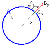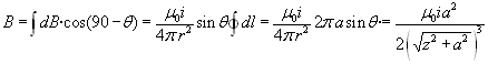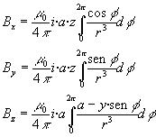 Por razón de simetría, las componentes perpendiculares al eje creadas por elementos diametralmente opuestos se anulan entre sí. Por tanto, el campo magnético resultante está dirigido a lo largo del eje y puede calcularse mediante una integración sencilla ya que r es constante y q es constante En el centro de la espira z=0, tenemos