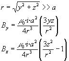 Aproximación: Puntos alejados de la espira. Dipolo magnéticoPartimos de nuevo de las ecuaciones Si el punto P está lejos de la espira, es decir, si se cumple que Podemos aproximar el denominador de las dos integrales que nos calculan el campo By y Bz. Donde hemos llamado ahora r a Las componentes del campo para r>>a, son aproximadamente El campo creado por una bobina de N espiras apretadas es N veces el campo producido por una de las espiras.