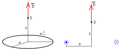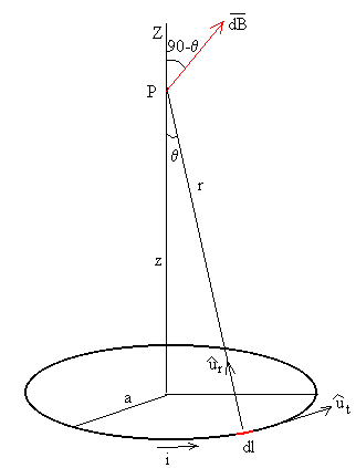Campo magnético producido por una corriente circular en un punto de su eje.En muchos dispositivos que utilizan una corriente para crear un campo magnético, tales como un electroimán o un transformador, el hilo que transporta la corriente está arrollado en forma de bobina formada por muchas espiras. Estudiaremos, en primer lugar, el campo creado por una espira. En la figura, se muestra una espira circular de radio a, recorrida por una corriente de intensidad i. El punto P está sobre el eje de la espira a una distancia z de su centro. Sea r la distancia entre el elemento de corriente y el punto P. La ley de Biot nos permite calcular el campo magnético creado por dicho elemento de corriente. Fijarse que los vectores unitarios ut y ur forman 90º El vector campo magnético dB tiene dos componentes