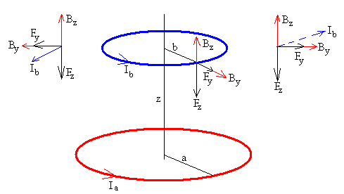 Fuerza entre dos espirasEn la figura, se muestran dos espiras contenidas en planos paralelos de radio a y radio b separadas una distancia z. Las espiras conducen corrientes Ia e Ib, respectivamente. Si las corrientes tienen el mismo sentido, la fuerza es atractiva y si tienen sentido contrario, la fuerza es repulsiva. El campo magnético producido por la espira de radio a, tiene dos componentes, uno radial By y la otra axial Bz, y sus valores en la posición que ocupa la segunda espira de radio y=b es. La fuerza que ejerce el campo magnético producido por la espira inferior de radio a, sobre la corriente que circula por la espira superior de radio b es
