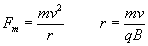 Una partícula cargada describe una semicircunferencia en un campo magnético uniforme. La fuerza sobre la partícula viene dada por el producto vectorial Fm=q·v´B, Su módulo es Fm=q·vB, su dirección radial y su sentido hacia el centro de la circunferencia