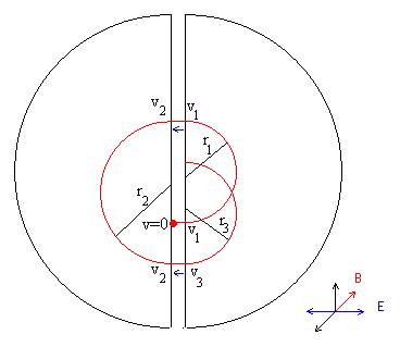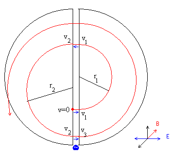 Se pulsa en el botón Empieza. Se pulsa el botón Pausa, si queremos parar dicho movimiento, por ejemplo para medir el tiempo que tarda el ión en describir una semicircunferencia. Se pulsa el mismo botón titulado ahora Continua, para que seguir el movimiento normal. Se pulsa varias veces el botón titulado Paso, para mover el ión un pequeño intervalo de tiempo cada vez. Por ejemplo, para acercarnos a la región entre las D's. Se pulsa el botón Continua para proseguir el movimiento normal. A medida que transcurre el tiempo, vemos como cambia la polaridad de los terminales marcados con los signos + y - situados en la parte inferior del ciclotrón. Una flecha en la región ente las dos D's indica el sentido del campo eléctrico en la región entre las dos D's Si no introducimos el tiempo adecuado, observamos que el campo eléctrico existente en la región comprendida entre las dos D's acelera primero los iones y luego, los frena hasta que eventualmente los para, en ese momento se deja de trazar la trayectoria. Ejemplo: