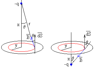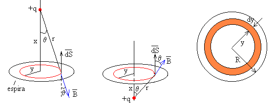 El flujo del campo magnético a través de una espira situada a una distancia x>0 de la carga magnética +q es donde dS=2πy·dy es el área del anillo comprendido entre los radios y e y+dy.