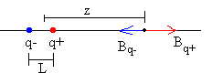 El flujo del campo magnético a través de las N espiras, producido por la carga magnética negativa situada a la distancia x=z+L/2 del centro de las espiras es de signo contrario al producido por la carga positiva
