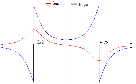 Flujo y fem producidos por las dos cargas magnéticasConsideremos ahora que z es la distancia entre el centro del imán y el centro de las N espiras apretadas. La distancia ente la carga positiva y el centro de las espira es x=z-L/2, y la distancia entre la carga magnética negativa y el centro de las espiras es x=z+L/2. El flujo del campo magnético a través de las N espiras producido por la carga magnética positiva situada a la distancia x=z-L/2 del centro de las espiras es Donde sgn es la función signo, positiva cuando x=z-L/2>0, y negativa cuando z-L/2<0. Por tanto,
