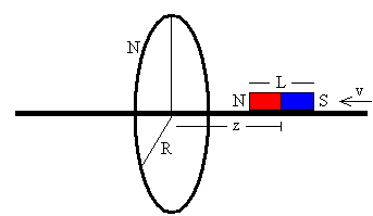 Para simular la experiencia, empelaremos una bobina de N espiras apretadas de radio R que es atravesada por un imán, tal como se muestra en la figura. El imán se mueve con velocidad constante v sobre un carril de aire En esta página, el campo magnético producido por un imán, se aproximará a la suma vectorial de los campos producidos por un par de cargas puntuales magnéticas o monopolos situados en sus extremos.