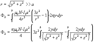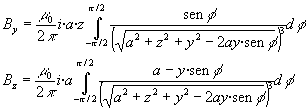 Flujo del campo magnético a través del secundarioSea I1 la corriente que circula por el primario. Calculamos el flujo del campo magnético producido por el primario a través del área encerrada por la espira de radio b (secundario). Dado que el plano de la espira es perpendicular al eje Z, el flujo de la componente Y del campo es nulo. El elemento diferencial de área es el área de un anillo de radio y y de anchura dy, su área es dS=2p y·dy