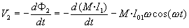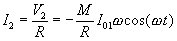 Ley de FaradayLa corriente alterna que circula por el solenoide produce un campo magnético que varía con el tiempo. El flujo F2 de dicho campo a través del anillo es F2=M·I1 donde M es el coeficiente de inducción mutua del sistema formado por el solenoide y el anillo, I1 es de la intensidad de la corriente en el solenoide que varía con el tiempo de la forma I1=I01·sen(w t) Donde I01 es la amplitud y w frecuencia angular w =2p f. En Europa f=50 Hz y en Estado Unidos f=60 Hz. Aplicando la ley de Faraday, se obtiene la fem inducida Ve en el anillo como resultado del cambio del flujo que lo atraviesa con el tiempo. Aplicando la ley de Lenz, se determina el sentido de la corriente inducida. La corriente inducida I2 en la espira de resistencia R es