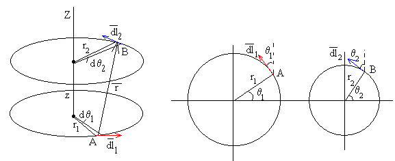j) El vector r que tiene por origen el punto A (r1·cosq1, r1·senq1, 0) y extremo el punto B (r2·cosq2, r2·senq2, z), r=(r2·cosq2-r1·cosq1)i+(r2·senq2-r1·senq1)j+zk Su módulo, o la distancia r entre dichos elementos de corriente es