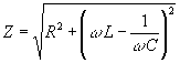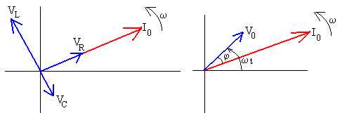 El vector resultante de la suma de los tres vectores es Se denomina impedancia del circuito al término de modo que se cumpla una relación análoga a la de los circuitos de corriente continua V0=I0·Z. El ángulo que forma el vector resultante de longitud V0 con el vector que representa la intensidad I0 es Las expresiones de la fem y de la intensidad del circuito son La intensidad de la corriente en el circuito está atrasada un ángulo j respecto de la fem que suministra el generador.
