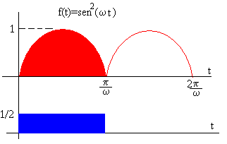 Resonancia en un circuito LCR en serieLa condición de resonancia la estudiamos en las oscilaciones forzadas de una masa unida a un muelle elástico. La potencia suministrada por el generador de corriente alterna es P=i·v=V0·I0sen(w t)·sen(w t-j ) P=V0·I0sen(w t)·(sen(w t)·cos j - cos(w t)·senj)=V0·I0(sen2(w t)·cos j - sen(w t)·cos(w t)·senj) Esta magnitud es una función complicada del tiempo que no es útil desde el punto de vista práctico. Lo que tiene interés es el promedio de la potencia en un periodo 2p /w . <P>=V0·I0(<sen2(w t)>·cos j - <sen(w t)·cos(w t)>·senj) Se define como valor medio <f(t)> de una función periódica f(t) de periodo T a la integral El periodo de la función f(t)=sen2(w t) es T=π/ω, su valor medio es <sen2(w t)>=1/2 El área de color rojo es igual al área de color azul. El periodo de la función f(t)=sen(w t)·cos(w t)=sen(2w t)/2 es T=π/ω, su valor medio es <sen(w t)·cos(w t)>=0 como puede comprobarse fácilmente El valor medio de la energía por unidad de tiempo, o potencia suministrada por el generador es El último término, cosj se denomina factor de potencia. El valor de <P> es máximo cuando el ángulo de desfase j es cero, para ello se tiene que cumplir que es decir, la frecuencia w del generador de corriente alterna debe coincidir con la frecuencia natural o propia w0 del circuito oscilante. Cuando w =w0 se cumple que