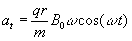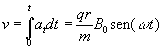 Las partículas se inyectan cuando el campo magnético es cero, por tanto, las partículas se aceleran solamente durante un cuarto de periodo, de 0 a P/4. Al cabo de este tiempo, se les proporciona un impulso adicional que las dirige hacia el blanco. En el instante t=P/4, cuando B adquiere su valor máximo B0, la velocidad de las partículas es (2) m·vmáx=qB0·r y la energía cinética máxima es Si B=B0·sen(w t) la aceleración tangencial dada por (1) vale Integrando obtenemos la velocidad de la partícula en cada instante, (suponemos que la partícula parte del reposo en el instante inicial t=0) Como vemos para w t=p/2, o cuando t=P/4 se obtiene la máxima velocidad vmáx de las partículas aceleradas. La velocidad máxima es independiente del valor del periodo P. Dependiendo del valor de P, las partículas tardarán más o menos tiempo en alcanzar la velocidad máxima.