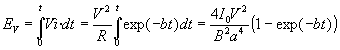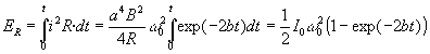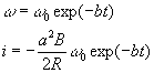 Ecuación del circuitoEl sentido de la fem Ve no cambia, por tanto, la corriente i circula ahora en sentido horario y vale (2) Ecuación del movimientoLa ecuación del circuito junto a la ecuación del movimiento (1), nos da la expresión de la velocidad angular y de la intensidad en función del tiempo. La solución de esta ecuación con las condiciones iniciales t=0, w =w0 es La velocidad angular del disco disminuye exponencialmente con el tiempo, la intensidad de la corriente inducida tiene el mismo comportamiento Balance energéticoLa energía cinética inicial La energía cinética en cualquier instante La energía disipada en la resistencia durante un tiempo t. La energía cinética que pierde el disco se disipa en la resistencia. Después de un tiempo, teóricamente infinito, toda la energía cinética inicial del disco se disipa en la resistencia en forma de calor.