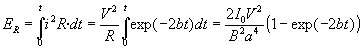 De las ecuaciones (1) y (2) obtenemos la expresión de la velocidad angular w del disco en función del tiempo, y de la intensidad i en función del tiempo. Cuya solución con las condiciones iniciales t=0, w =0, es Como vemos la velocidad angular del disco crece desde cero hasta un valor máximo dado por 2V/(Ba2) y es independiente de la resistencia R. La resistencia determina el tiempo (la inversa de b) que tarda el disco en alcanzar dicha velocidad máxima. La intensidad decrece exponencialmente con el tiempo. Como podemos apreciar en la ecuación del circuito la intensidad es la diferencia de dos términos, la intensidad producida por la batería que es constante e igual a V/R, y la intensidad de la corriente inducida que se opone a ésta y crece desde cero hasta que alcanza el valor límite constante V/R. Estos dos términos los representamos en la parte inferior derecha del applet, al final de esta página. Balance energéticoLa energía cinética del disco en cualquier instante t es La energía suministrada por la batería en la unidad de tiempo (potencia) es V·i, y en el tiempo t es La energía disipada en la resistencia R en la unidad de tiempo es i2·R, y en el tiempo t es Podemos comprobar que Ek+ER=EV, parte de la energía suministrada por la batería se invierte en energía cinética del disco y la otra parte, se disipa en la resistencia. En la parte superior derecha del applet, un círculo representa la energía suministrada por la batería que está dividido en dos sectores el de color azul representa la energía cinética del disco y el de color negro la parte disipada en la resistencia. Al cabo de un cierto tiempo, teóricamente infinito pero que en la práctica depende de la constante de tiempo (inversa de b) la energía suministrada por la batería EV tiende a un valor constante, y se divide en dos partes iguales, la mitad como energía cinética del disco Ek (gira con velocidad constante) y la otra mitad se disipa en la resistencia ER.