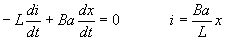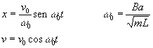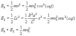 Resistencia nula (L¹ 0, R=0)Consideremos que la espira está hecha de un material superconductor de modo que R» 0. En este caso, no podemos ignorar la autoinducción L, que produce una fem La ecuación del circuito (suma de fems igual a intensidad por resistencia) se escribe ahora VL+Ve =0. que satisface la condición inicial x=0, i=0. La fuerza que ejerce el campo magnético sobre el lado derecho de la espira será de nuevo F=-iaB, por lo que la ecuación del movimiento se escribirá Esta es la ecuación diferencial de un oscilador libre, que describe el Movimiento Armónico Simple x=A·sen(w0 t+f ). A partir de las condiciones iniciales para t=0, x=0, dx/dt=v0 calculamos la amplitud A y la fase inicial f . Siempre que la amplitud de la oscilación v0/w0 no sea mayor que la longitud de la espira, de modo que la espira no esté completamente introducida en la región x³ 0, la espira describirá un MAS con frecuencia angular w0 y periodo P=2p/w0. La intensidad de la corriente vale La máxima intensidad no depende de la anchura a de la espira, ni del campo magnético B. Estudio energéticoLa energía cinética de la espira más la energía acumulada en la autoinducción en forma de campo magnético debe de ser constante e igual a la energía cinética inicial.