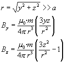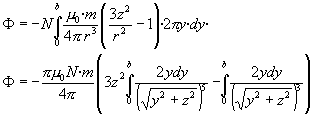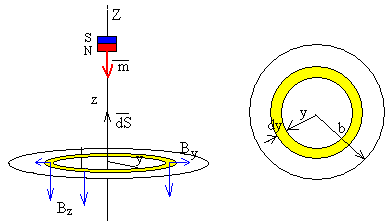 DescripciónHemos calculado el campo magnético producido por una espira en un punto fuera de su eje. En particular, para aquellos puntos alejados de la espira en comparación a su radio a, las componentes del campo tienen una expresión más simple. El flujo del campo producido por el imán a través de una bobina de radio b formada por de N espiras apretadas es. Dado que el plano de la espira es perpendicular al eje Z, el flujo de la componente Y del campo es nulo. Por otra parte, como Bz apunta hacia abajo el flujo es negativo, tal como vemos en la figura. El elemento diferencial de superficie dS, es el área de un anillo de radio y y de espesor dy, su valor es dS=2p y·dy Aplicando la ley de Faraday En la figura se muestra el flujo (en color azul) y la fem (en color rojo).