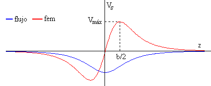 Esta función tiene dos extremos (un máximo y un mínimo) que calculamos haciendo dVe /dz=0 y se sitúan en z=±b/2., como podemos comprobar fácilmente. El valor máximo de la fem es El valor máximo de la fem Ve es más grande para bobinas de menor radio b.