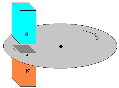 Hasta ahora hemos considerado ejemplos en los cuales las corriente inducidas están obligadas a seguir trayectorias bien definidas a través de hilos hechos de material conductor. Los equipos eléctricos están formados por piezas, trozos de conductor que se mueven en un campo magnético o están situadas en un campo magnético variable, dando lugar a corrientes inducidas que circulan por el volumen del conductor. Estas corrientes se denominan de Foucault. Cuando se coloca una pieza de metal en un campo magnético variable con el tiempo B(t), se genera un campo eléctrico que produce un movimiento de las cargas libres en el conductor metálico, generando corrientes. Estas corrientes disipan energía en el metal en forma de calor. Daremos un ejemplo, en la siguiente página dedicada a las corrientes de Foucault. Cuando una pieza de metal se mueve en una región en la que existe un campo magnético no uniforme pero constante en el tiempo B(r) se generan corrientes y la energía se disipa en el conductor metálico. Este fenómeno se puede explicar por medio de la fuerza de Lorentz. A causa de la disipación de la energía se produce una fuerza de frenado que disminuye la velocidad de la pieza metálica. En esta página, daremos una descripción cualitativa de las corrientes de Foucault, teniendo presente el comportamiento de una espira que atraviesa una región en la que existe un campo magnético uniforme con velocidad constante. A continuación, mediante un modelo simple se demostrará que la fuerza de frenado es proporcional a la velocidad de la pieza metálica, concluyendo con un programa interactivo, que muestra los efectos de la fuerza de frenado en un disco en rotación como el que se muestra en la figura..