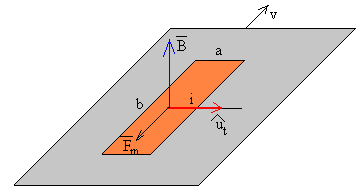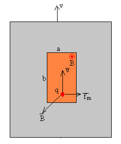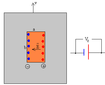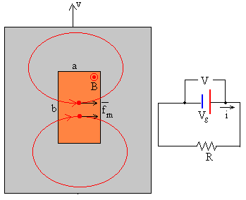 Supongamos que el campo magnético B es perpendicular al plano de la hoja metálica, al moverse la pieza metálica con velocidad v, los portadores de carga q existentes en la pequeña región rectangular de dimensiones a y b experimentan una fuerza fm=q(v×B), tal como se muestra en la figura. Los portadores de carga son impulsados por la fuerza magnética hacia la derecha. La separación de cargas produce un campo eléctrico E=-v×B, dirigido hacia la izquierda. Tenemos el equivalente a una batería cuya fem es igual a la diferencia de potencial Vε =vBa medida en circuito abierto. La pequeña región rectangular no está aislada del resto de la hoja metálica, que proporciona la conexión entre los dos terminales de la imaginaria batería por el que circula una corriente de intensidad i. El resto de la pieza metálica opone una resistencia R al paso de la corriente eléctrica. Mientras que la pequeña región rectangular presenta una resistencia interna r que podemos calcular aplicando la ley de Ohm.