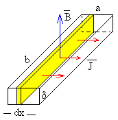 La fuerza Fm se opone a la velocidad v de la pieza metálica y es proporcional a su velocidad, y al cuadrado del campo magnético B. El producto δab es el volumen de la porción de la pieza metálica que está bajo la influencia del campo magnético uniforme B. La energía disipada en la unidad de tiempo, es el producto de la fuerza por la velocidad, Fm·v, es proporcional al cuadrado del producto de la intensidad del campo magnético por la velocidad. Deducción alternativaDe la ley de Ohm y de la fuerza de Lorentz, calculamos la densidad de corriente J J=σ(E+v×B)