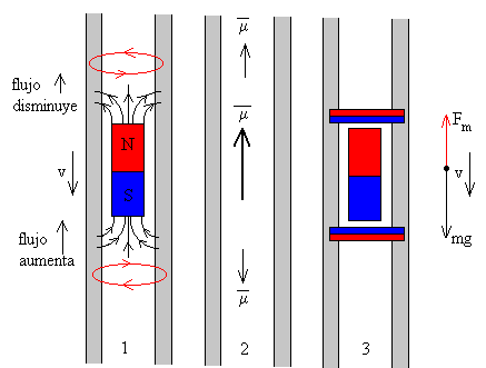 El momento magnético del imán y el de las corrientes inducidas está representado en la parte (2) de la figura. En la figura (3), mostramos la equivalencia entre corrientes (espiras o solenoides) e imanes, de modo que la corriente inducida por delante del polo Norte equivale a un imán de polaridad opuesta, por lo que se repelen. Sin embargo, la corriente inducida por detrás del imán tiene la misma polaridad por lo que se atraen. El imán que desciende por el tubo metálico es repelido por delante y atraído por detrás. Esta es la explicación cualitativa de la fuerza de frenado en términos de la ley de Lenz.