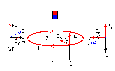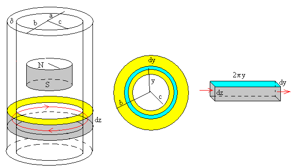 La fuerza resultante sobre la espira es vertical, anulándose por simetría en la dirección radial. dFz=IBydl=JBy·dV donde J es la densidad de corriente y dV=2πy·dy·dz es el elemento de volumen, véase la figura más arriba.