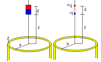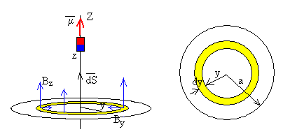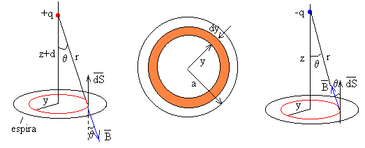Si el tubo tiene un radio medio a, y un espesor δ. El flujo del campo magnético producido por la carga magnética positiva través de una espira de radio a, para z+d>0, es donde dS=2πy·dy es el área del anillo comprendido entre los radios y e y+dy.