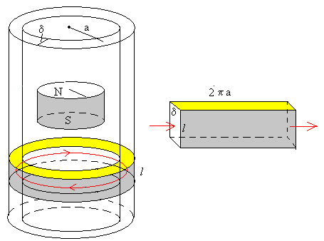 Balance energéticoEn el apartado anterior, hemos calculado la fuerza de frenado del imán Fz que es proporcional a la velocidad v del imán y la velocidad límite constante con la que cae cuando la fuerza de frenado se iguala al peso, Fz=mg. Es conveniente imaginar que el tubo metálico de radio medio a y espesor δ está uniformemente subdividido en anillos paralelos de longitud l.